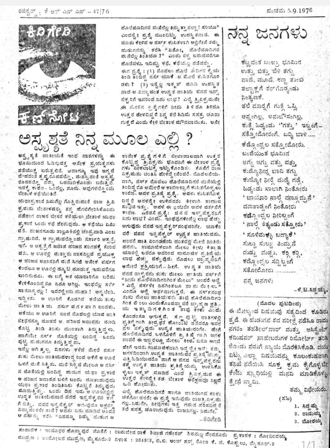 [ದೇವನೂರ ಮಹಾದೇವ ಅವರ ಈ ಬರಹ ಮೊದಲು ದಿನಾಂಕ 05/09/1976 ರಂದು ‘ಪಂಚಮ’ ಪಾಕ್ಷಿಕ ಪತ್ರಿಕೆಯಲ್ಲಿ (ಸಂಪುಟ: 01, ಸಂಚಿಕೆ-05, ಪುಟ: 06, 1976, ಸಂಪಾದಕರು: ಇಂದೂಧರ ಹೊನ್ನಾಪುರ) ಪ್ರಕಟಗೊಂಡಿತ್ತು. ಇದನ್ನು ಹುಡುಕಿ ನಮಗೆ ಕಳಿಸಿದ ಆರ್.ಶ್ರೀಧರ ಅವರಿಗೆ ಧನ್ಯವಾದಗಳು] ಆಮೇಲೆ, ಇದೇ ಬರಹ ಒಂದು ವಾರದ ನಂತರ ಆಂದೋಲನ ಪತ್ರಿಕೆಯಲ್ಲಿ (12/09/1976) ಪ್ರಕಟವಾಗಿದೆ. ಇದನ್ನು ಕಾಪಿಟ್ಟು, ಹುಡುಕಿ ನಮಗೆ ಕಳಿಸಿದ ಪ್ರಸಾದ್ ರಕ್ಷಿದಿಯವರಿಗೆ ನಮ್ಮ ಧನ್ಯವಾದಗಳು.]