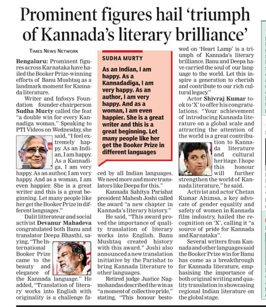 ಸಾಹಿತಿ ಬಾನು ಮುಷ್ತಾಕ್ ಅವರಿಗೆ “ಅಂತರಾಷ್ಟ್ರೀಯ ಬೂಕರ್” ಪ್ರಶಸ್ತಿ 2025 ಸಂದ ಸಂದರ್ಭದಲ್ಲಿ-Prominent Figures hail ‘triumph of kannada’s literary brillilliance’